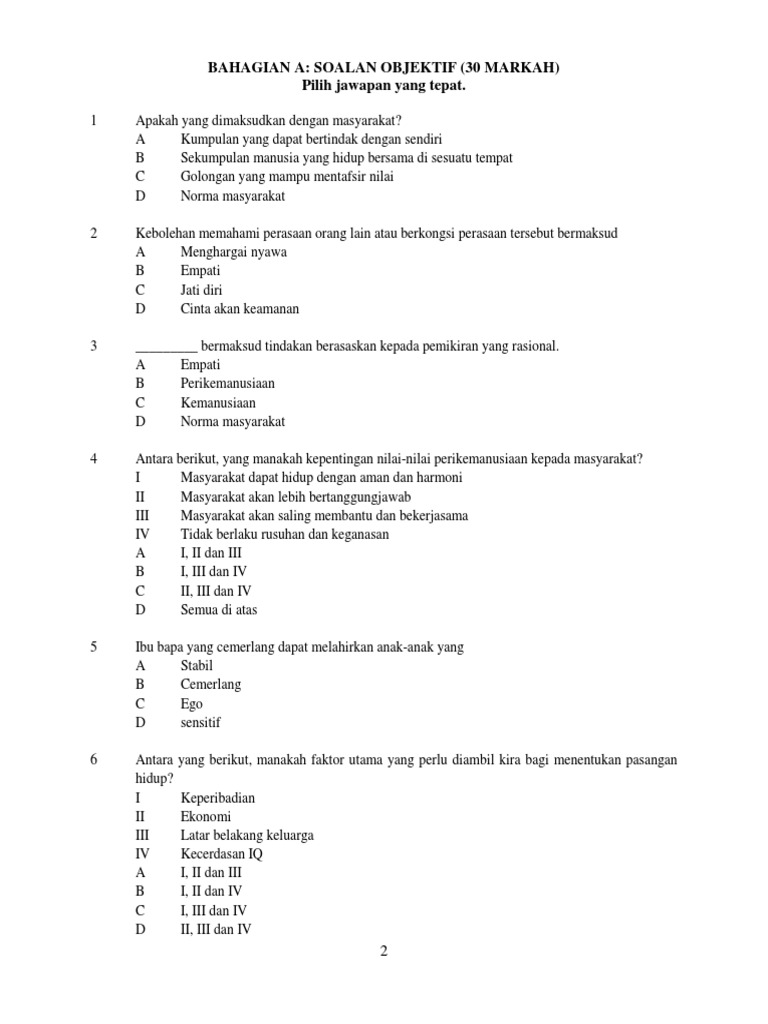 Bahagian A Soalan Objektif 30 Markah Pilih Jawapan Yang Tepat