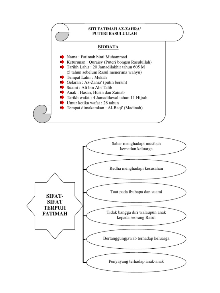 Fatimah binti muhammad atau lebih dikenal dengan fatimah az zahra fatimah yang selalu berseri bahasa arab. Fatimah az zahra memiliki kepribadian yang sabar dan penyayang karena dan tidak pernah melihat atau dilihat lelaki yang bukan mahromnya. Puteri bongsu rasulullah tarikh lahir. 20 jamadilakhir 605m 5 tahun sebelum nabi muhammad terima wahyu.