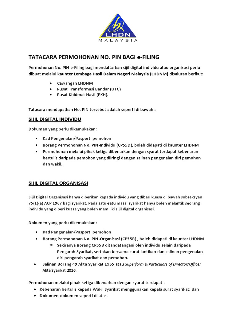 Permohonan No Pin E Filing Dan Login Ezhasil Kali Pertama