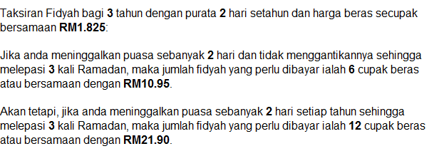 Cara bayar fidyah sbg contoh buat makan di masjid tiap2 bulan sebanyak mana yang mampu katakan 100 cupak beras sebulan. Tinggal puasa 2 hari 2 tahun lepas bayar 4 cupak. Cara kira kadar dan cara bayar fidyah. Tinggal puasa 1 hari tahun lepas dan 1 hari 2 tahun lepas bayar 3 cupak.