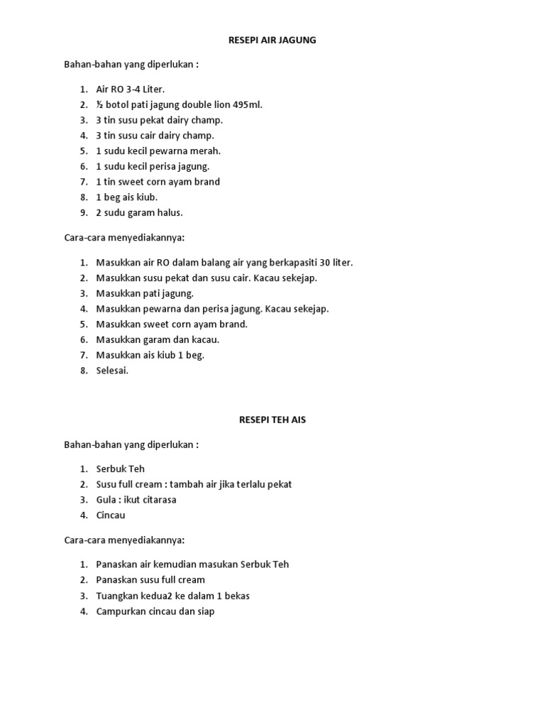 1 beg ais kiub. Semua resepi ini adalah hasil kreativiti dan inovasi daripada hasil tanaman atau buah buahan. Masukkan pewarna dan perisa jagung. Anda boleh membuat eksperimen terlebih dahulu dengan membuat air berlainan setiap hari mana jus yang laris itulah jus atau air yang akan anda kerap jual nanti.